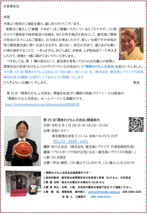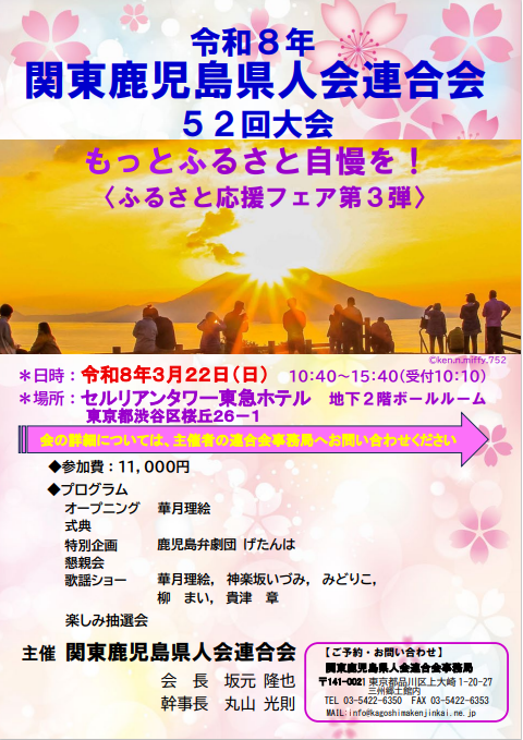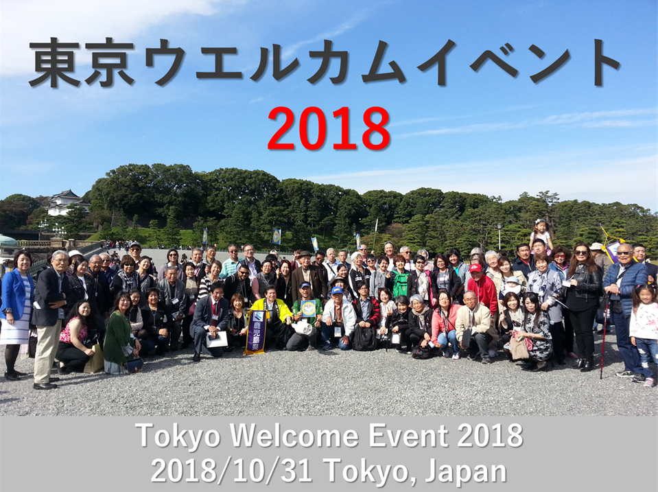 鹿児島で開催された、第一回鹿児島県人世界大会に併せて、在京の3県人団体共催により2018年10月31日(快晴)に「東京ウエルカムイベント」が開催されました。 南北米大陸をはじめ海外から鹿児島ゆかりの方々110名余が皇居訪問、浅草散策に参加され、霞が関ビル「東海大学校友会館」での歓迎式典では在京の県人350余名が暖かく迎えました。 当日の映像ビデオなどは下記バナーよりウエッブサイトをご覧ください。 Hosted by three prefectural associations in Tokyo, the event took place on October 31, 2018 (clear weather). Over 110 participants with ties to Kagoshima from abroad, including North and South America, visited the Imperial Palace and participated in a stroll around Asakusa. At the welcome ceremony held at the Kasumigaseki Building 'Tokai University Alumni Association Hall,' more than 350 prefectural residents in Tokyo warmly welcomed them. For more details, please click the Web-site below.
