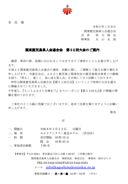 関東鹿児島県人会連合会51回大会セルリアンタワー東急ホテル・ボールルーム令和7年3月30日(日)11:00~15:40 |