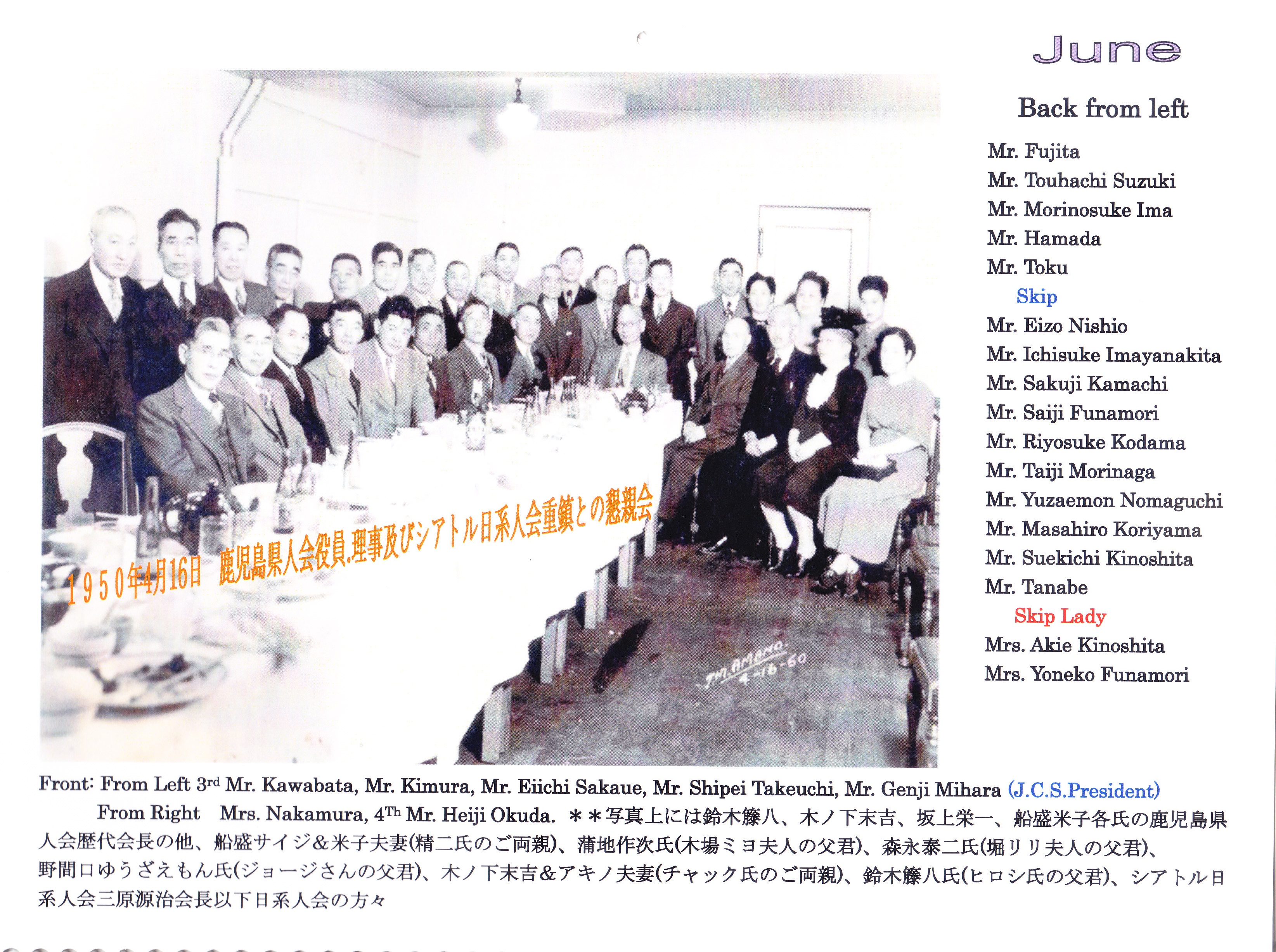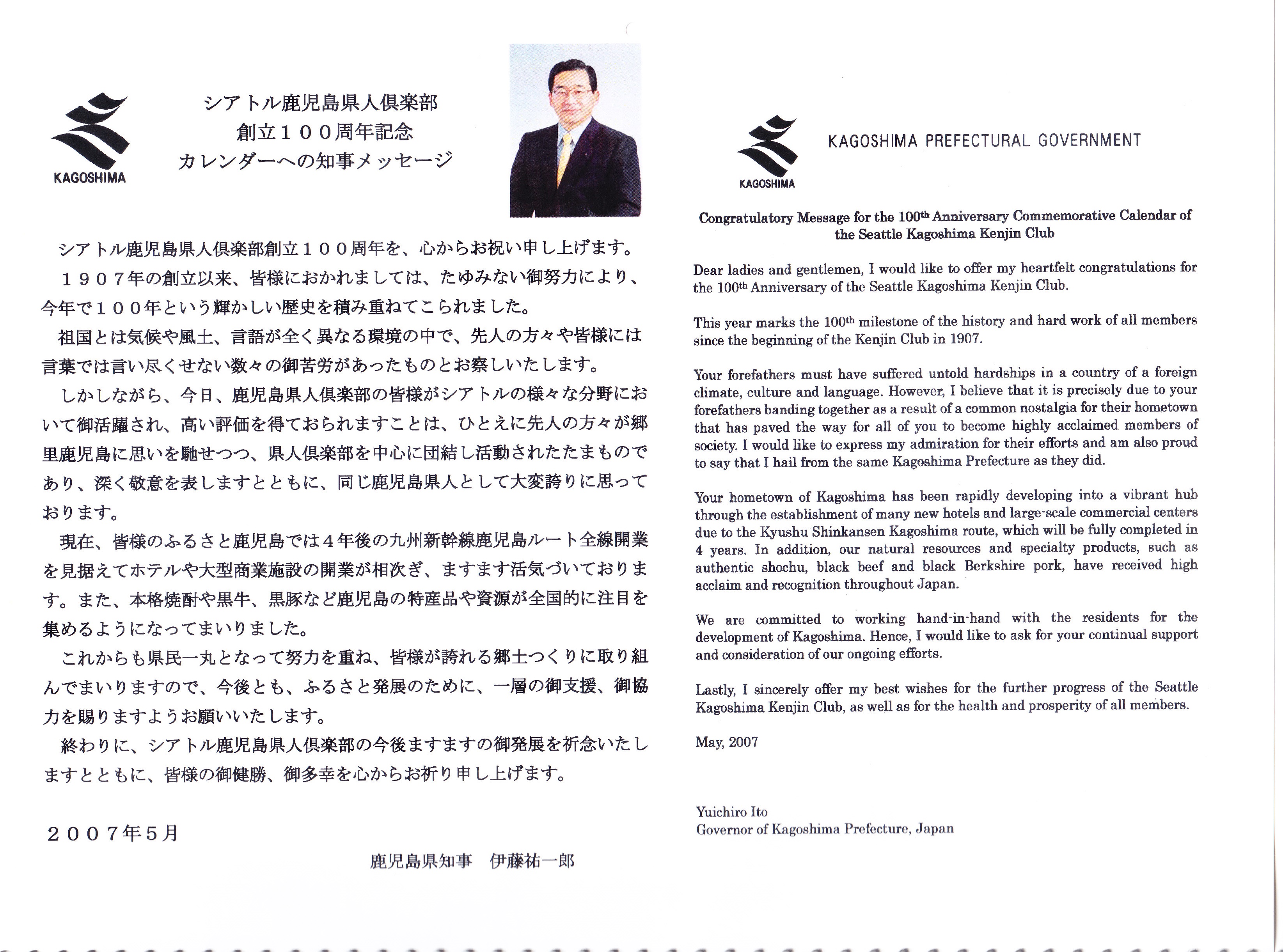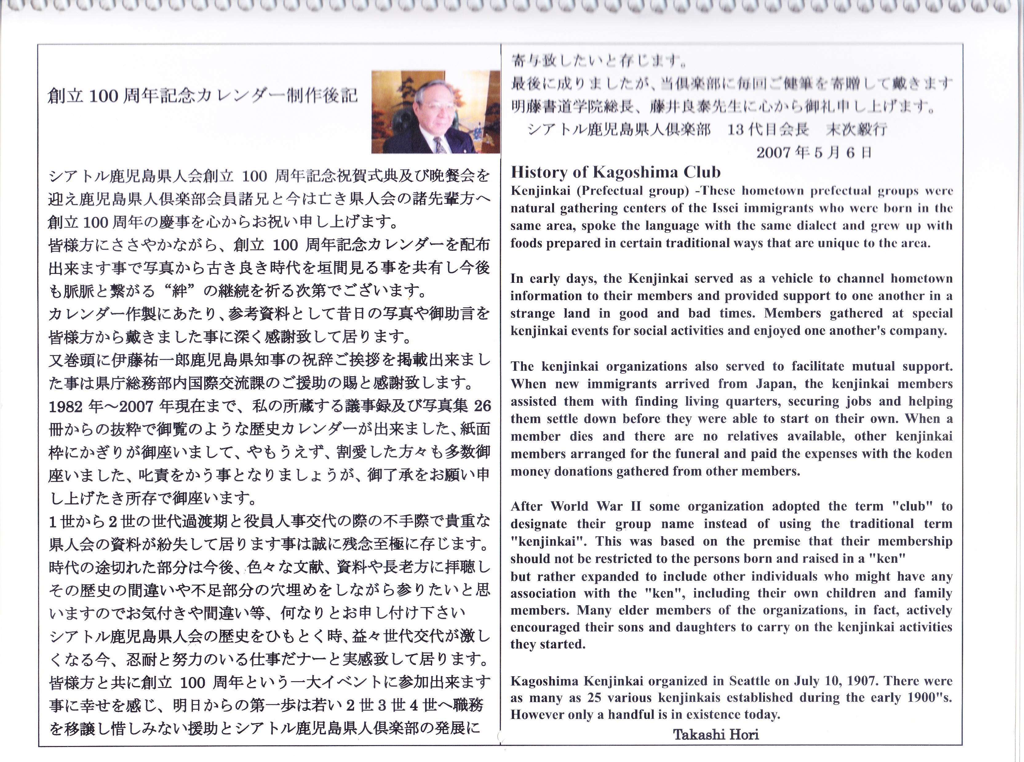 | シアトル鹿児島県人倶楽部 第13代目 会長末次毅行 拝 |