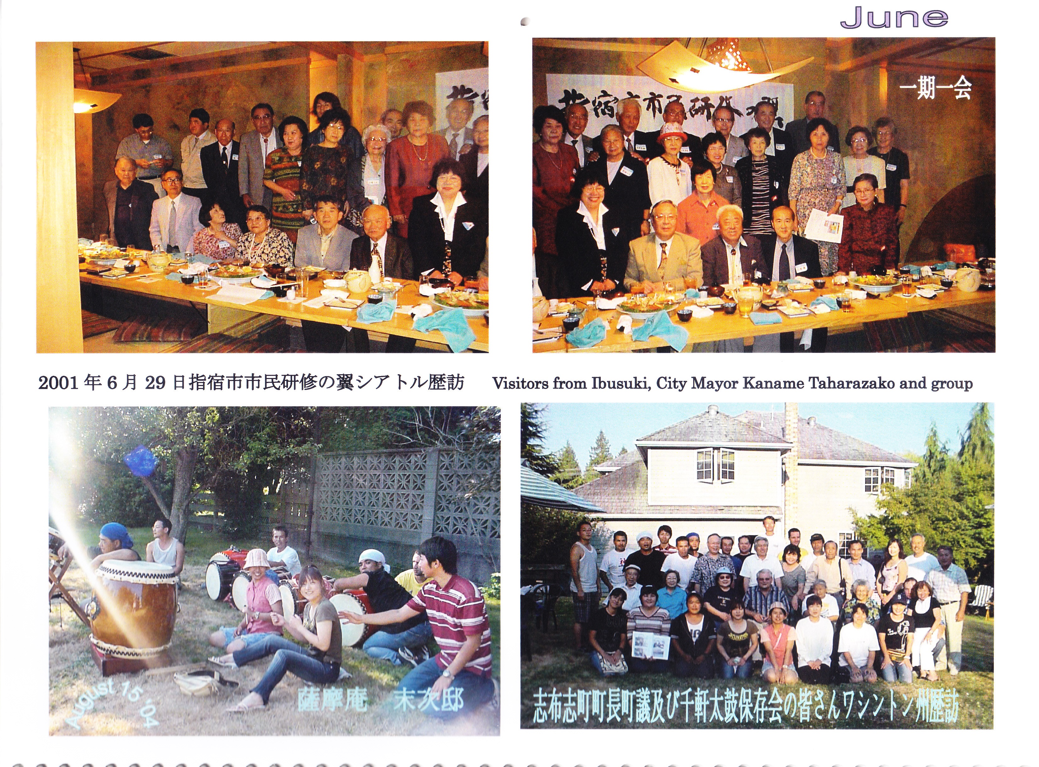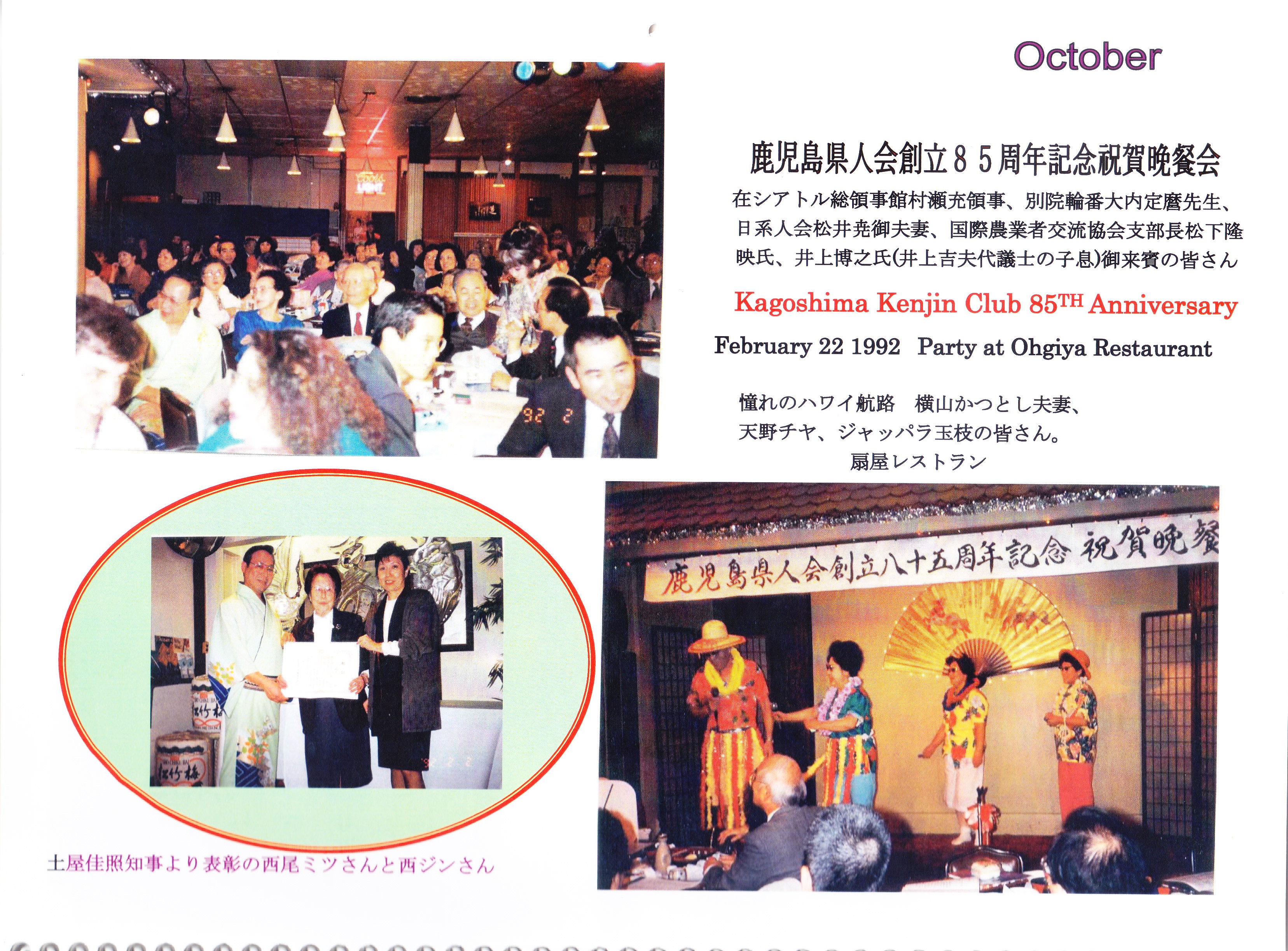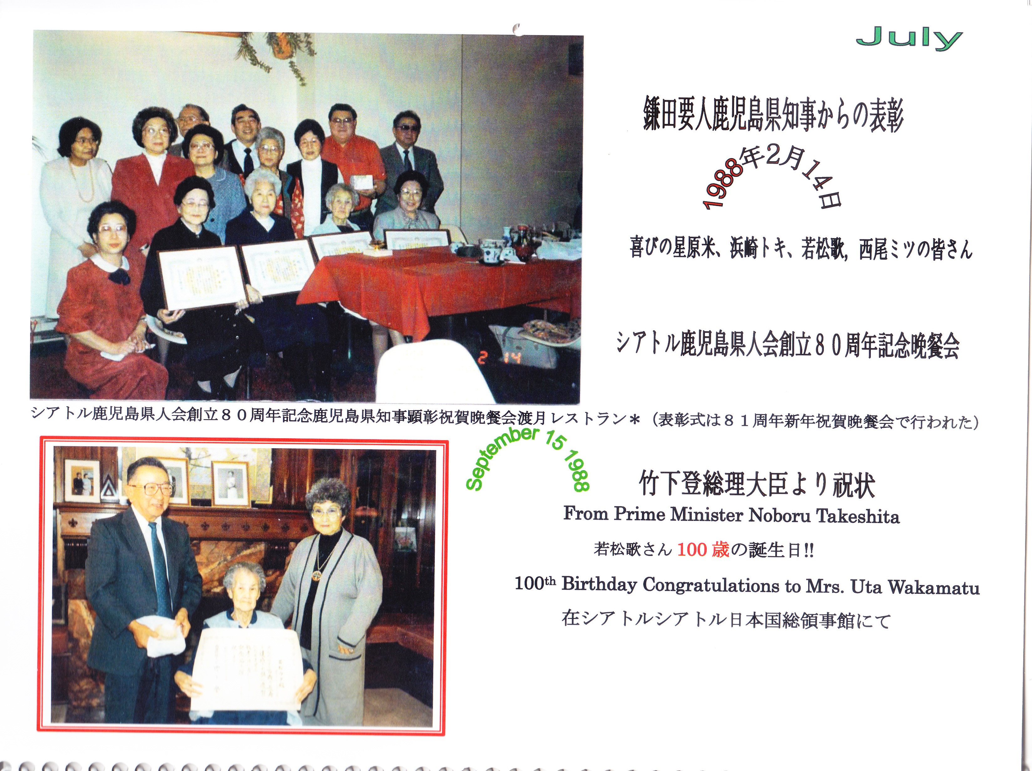 | 郵便にて100周年記念祝賀の各会員諸兄に配布した皆様方の鹿児島県知事及びワシントン州知事祝辞そして三州倶楽部のお二方が記された祝辞パンフレットと当時のカレンダー18か月分、此れには鬼籍と成られた移民一世や其のお子様方二世、現在では90歳以上多くは二世の方々もお亡くなりに成りましたが、此のカレンダーの暦の役目は終わっても過去に刻んだ一世、二世の足跡貴重な歴史は失われない!! 後を受け継ぐ会員の楽しい新年会やピクニックも一緒に記載され、次期世代へと受け継がれるであろう事を願ってやみません。 其れとUSBに鹿児島県人倶楽部の活動模様と小生の各コミュニティーでの活動を収録致しました。他県の農林水産物の展示会がシアトルでは頻繁に開催されて居りますのでご参考までに収録致して居りますのでご希望があれば、いつでもお分けいたします。 |