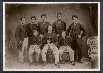 朝倉盛明、町田申四郎、鮫島尚信、 寺島宗則、吉田清成、 前列左から 町田清蔵、町田久成、長沢鼎 |
