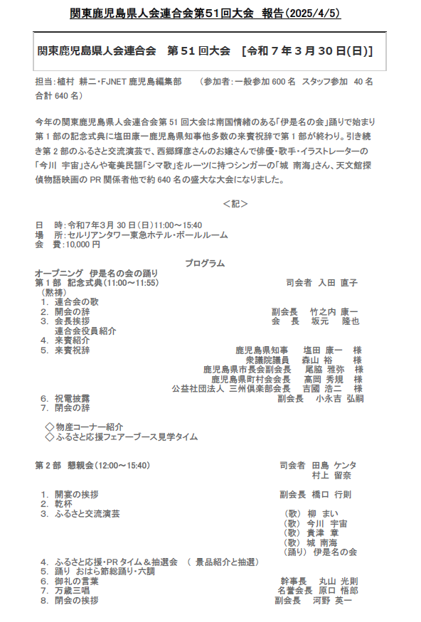 関東鹿児島県人会連合会51回大会セルリアンタワー東急ホテル・ボールルーム令和7年3月30日(日)11:00~15:40 |