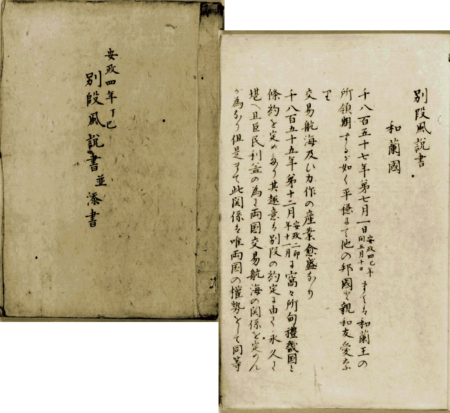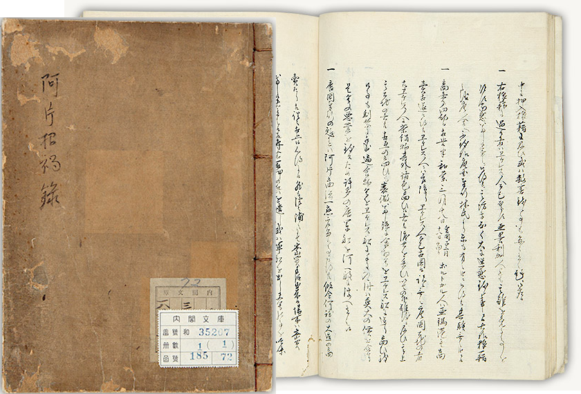 幕府は、オランダに風説書(ふうせつがき)の提出を義務付け国際情報を得ていたが、アへン戦争が起きると、これとは別により詳細な情報(別段風説書)を入手した。 1840年(天保11)から1843年(天保14)まで、出島のオランダ商館長から提出された4通の別段風説書の日本語訳をまとめた『阿片招禍録』には「唐国にてエケレス人阿片商法停止ニ付記録致候事」等の表題が付けられ、戦争の経済的背景と戦闘の具体的様相、締結された条約の内容まで、アヘン戦争の一部始終が詳しく報告されている。(国立公文書館所蔵、画像クリックで拡大)