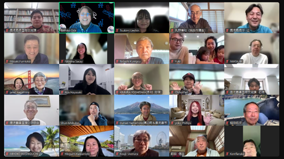 La primera reunión del "Grupo Mundial de Personas de Kagoshima", representado por los señores Tomita y Oda de California, Estados Unidos, se llevó a cabo en línea, reuniendo a 44 personas originarias de Kagoshima de todo el mundo, incluyendo Japón, Estados Unidos, Hong Kong, Vietnam, China, República Dominicana y Tailandia. Los participantes compartieron sus presentaciones, su conexión con Kagoshima y su situación actual de residencia, y se intercambiaron opiniones sobre eventos y celebraciones relacionadas con su tierra natal en cada país, así como proyectos e iniciativas relacionadas con Kagoshima. La próxima reunión está prevista para este otoño.